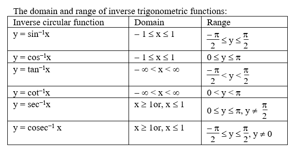 The inverse circular function x = sin y, x = cos y and x = tan y are generally written as y = sin-1 x, y = cos-1 x and y = tan-1 x.
